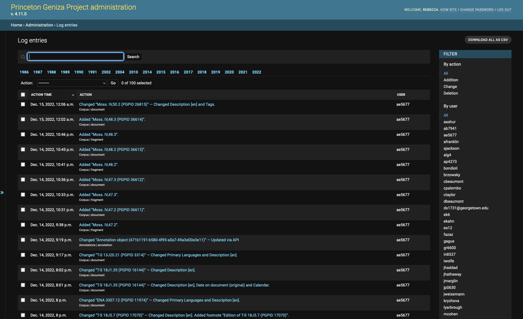 Screenshot of the Django Admin log entry list view on the Princeton Geniza Project.